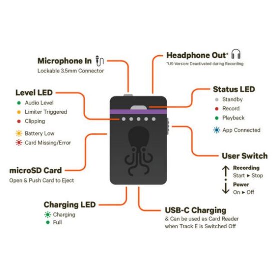 The TRACK E uses a changeable SD card for recording the audio. An input limiter and a high- pass filter guarantee for pristine recording quality. A screwable mini jack connector offers maximum security for connecting microphones. The TRACK E features plugin power for supporting a wide range of microphones. A free license of Tentacle Sync Studio (Mac) is included with every TRACK E purchase.
